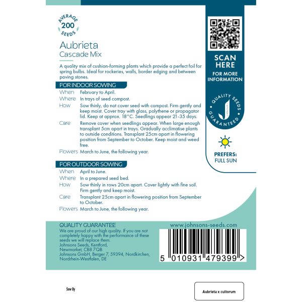 Johnsons Aubrieta Cascade mixed seeds produce colourful, trailing blooms perfect for rock gardens, borders, and containers. These hardy perennials offer early spring colour, creating a stunning carpet of vibrant flowers that attract pollinators like bees and butterflies. Ideal for adding texture and charm to your garden, Aubrieta Cascade mixed thrives in sunny locations and well-drained soil.