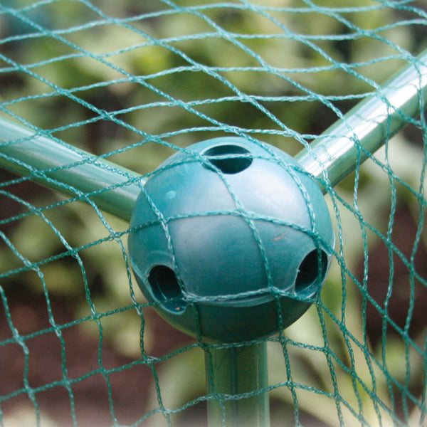 If you would like to build your own fruit frame, plant support or other structure in the garden, take a look at this simple, but clever idea. Solid rubber balls, each with four holes equidistant around the circumference and with slightly large holes top and bottom join canes or tubes to form a range of structures.