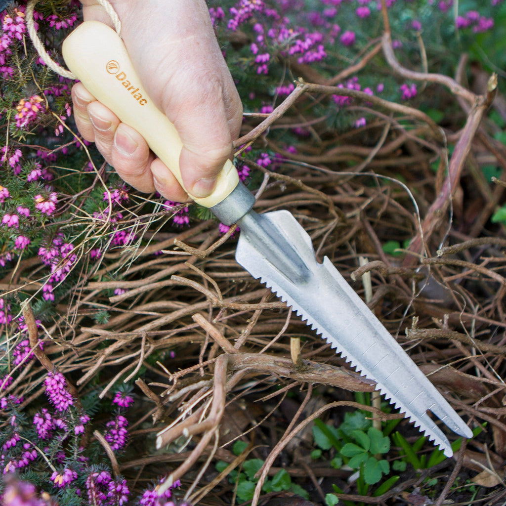 For use in cultivated soil. A versatile tool with five diverse applications: saw for roots, string cutter, depth marker, weed lifter and compost bag opener. Eco friendly bamboo handle and stainless steel head. This beautifully finished tool goes through many processes to create a product that is not only aesthetically pleasing, it encompasses great strength and durability too. The stainless steel head is hand welded and treated, to assume the appearance of old steel and still retain the rust resistant qualities of traditional looking stainless. Soil adhesion is greatly reduced; nonetheless, it maintains the same rustic beauty of tools from bygone days! Bamboo is a 100% sustainable source replenishing itself within 36 months. It is comparable to the tensile strength of steel, yet the finish is akin to traditional ash.