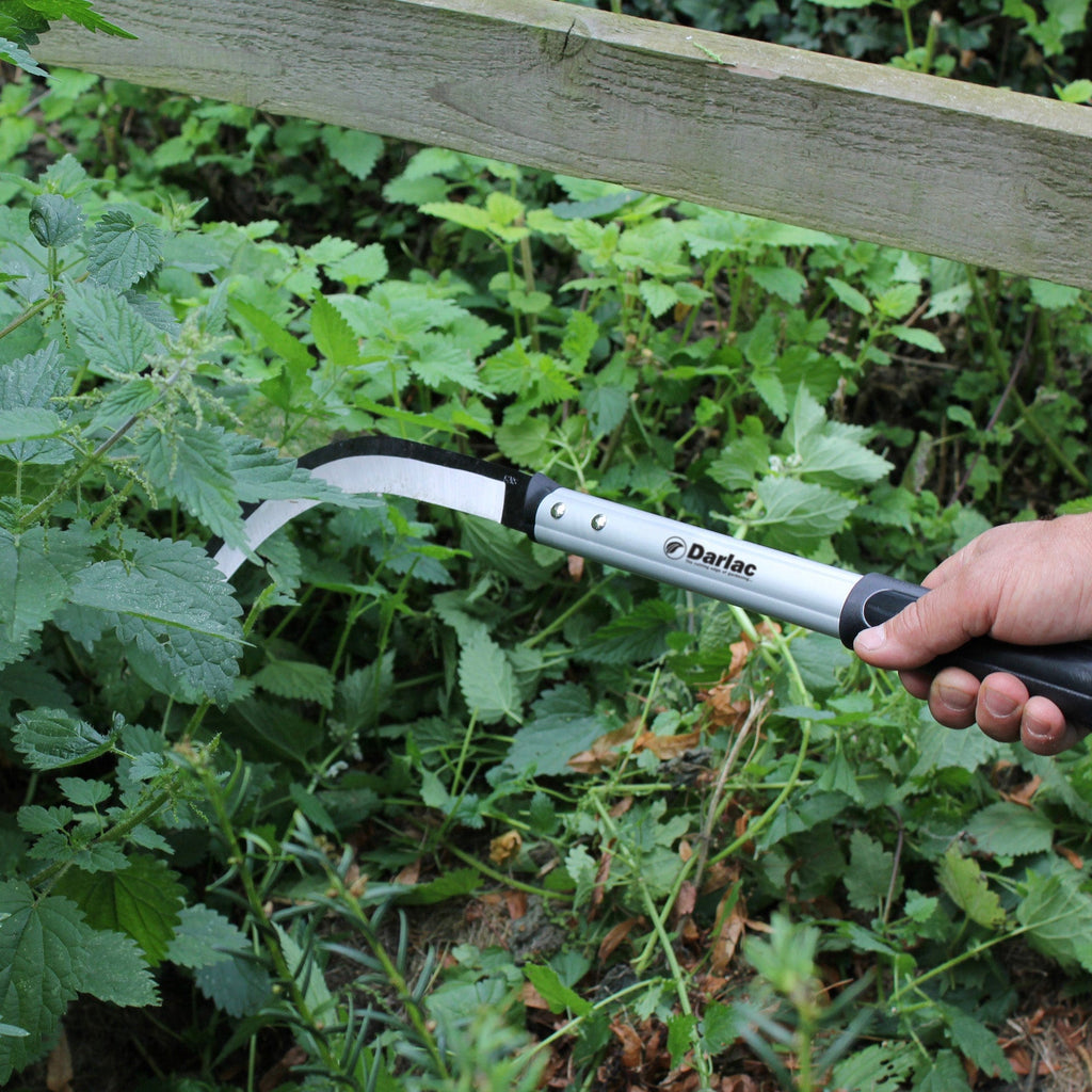 Designed for clearing nettles, thistles, briars, undergrowth and vegetation. Features an aluminium handle with a solid rubber grip and a razor-sharp carbon steel blade which is resharpenable. Cut with a slicing rather than hacking action pulling back on the handle at the end of a swing. USE EXTREME CARE when working with sharp objects.