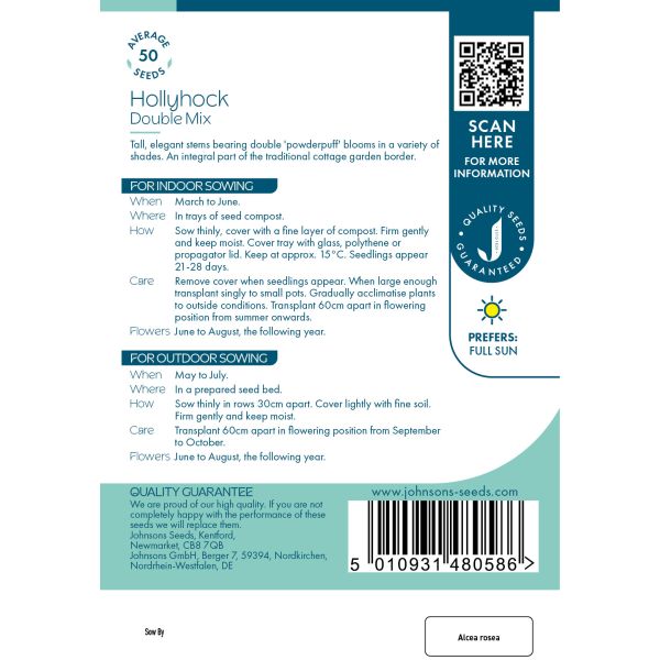 Shop Hollyhock Double mixed seeds today and explore Johnsons range of hardware for gardens to enhance your planting projects.