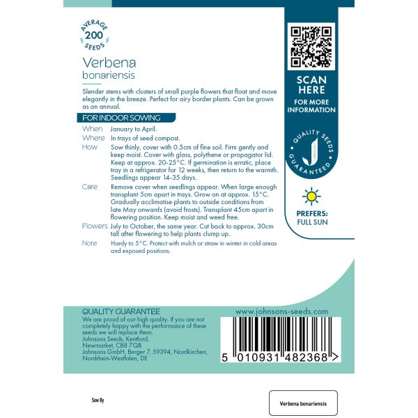 Add height and elegance to your garden with Johnsons Verbena Bonariensis seeds. Known for its tall stems topped with clusters of delicate purple flowers, Verbena is perfect for garden borders and cottage gardens. This variety is highly attractive to pollinators, making it a great choice for wildlife-friendly spaces.